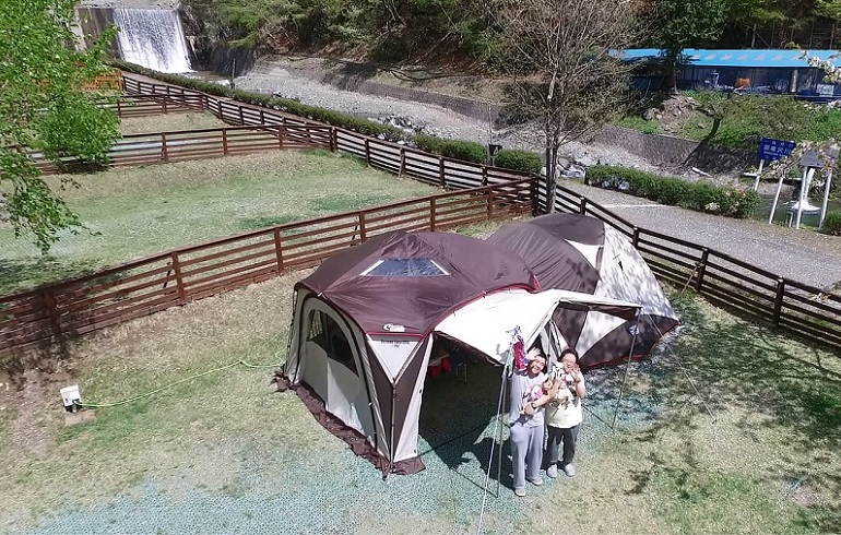 山梨県のウエストリバーオートキャンプ場には、約150㎡のドックランサイトがあり、ペット連れキャンパーにはうれしい限り♪ ドックランサイトの雰囲気もわかるように空からサイトをパシャリ。